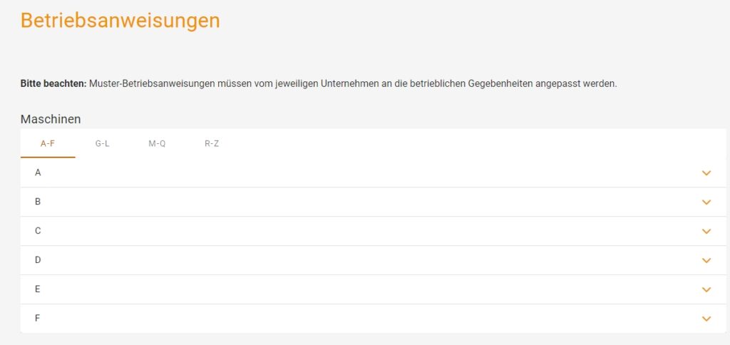 Über die oberen waagerechten Reitern können Sie zwischen den verschiedenen Buchstabenabschnitten wechseln. Wenn Sie auf die einzelnen Buchstaben klicken, öffnet sich ein Feld mit allen Betriebsanweisungen zu dem jeweiligen Buchstaben. Durch einen Klick auf die gewünschte Betriebsanweisung, öffnet sich diese als Word-Formular zum herunterladen.