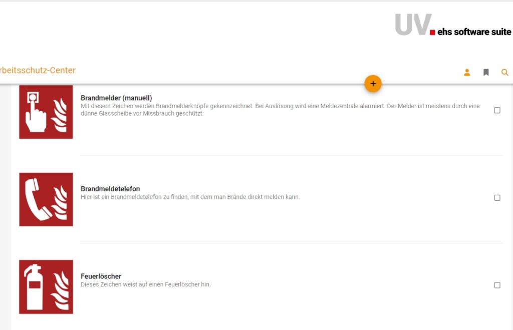 In dem Reiter Sicherheitszeichen und Symbole finden Sie eine Übersicht verschiedener Sicherheitszeichen und Symbole mit Erklärungen. Sie können eins oder mehrere herunterladen indem Sie auf das Kästchen hinter den Symbolen klicken und danach auf Auswahl herunterladen klicken.