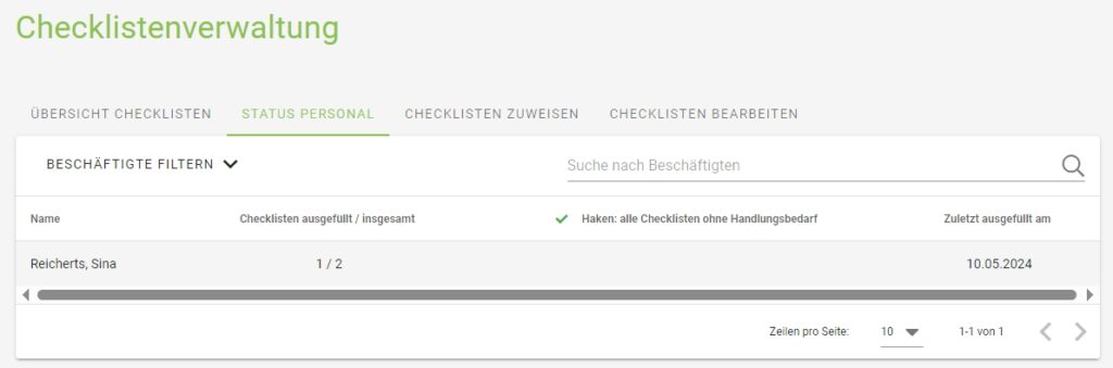 Hier haben Sie eine Übersicht über die Ergebnisse der verschiedenen Benutzer. Sie können hier einsehen, wie viele Checklisten der Benutzer zugewiesen bekommen hat und wie viele davon bearbeitet worden sind. Sollten alle Checklisten keinen Handlungsbedarf aufweisen, erscheint neben dem Benutzer ein grüner Haken.