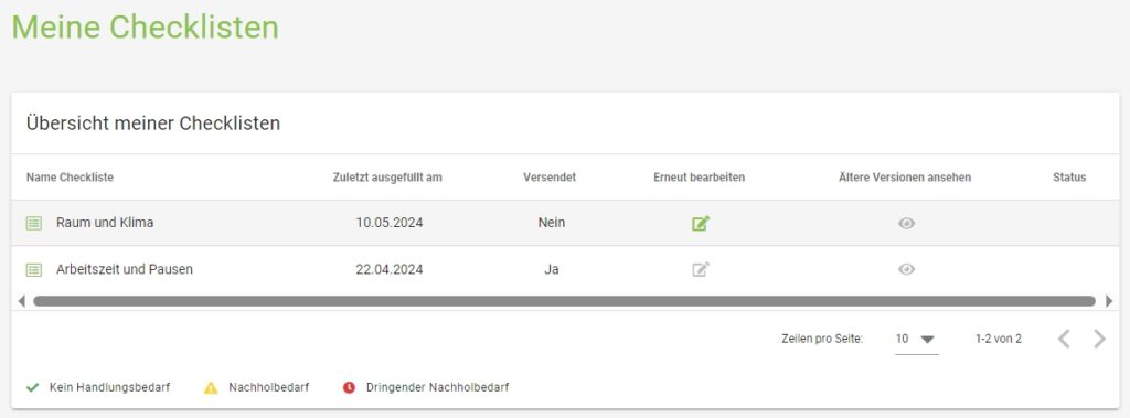 Hier finden Sie alle Checklisten, welche Ihnen jemals zugewiesen worden sind. Sie können in diesem Bereich die Checklisten erneut bearbeiten und den Status bezüglich des Optimierungsbedarfs einsehen.