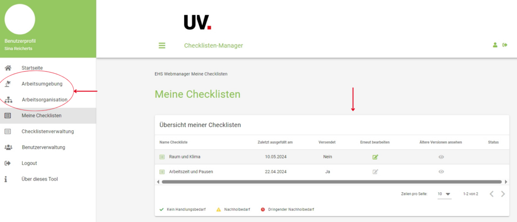 Ihre noch zu bearbeitenden Checklisten finden Sie entweder im Bereiche Meine Checklisten oder links im Menü. Dort sind die einzelnen Checklisten in Kategorien, wie zum Beispiel Arbeitsumgebung aufgelistet. Sie wählen selbst, wann und in welcher Reihenfolge Sie diese Checklisten ausfüllen. Wenn Sie nicht alle Fragen auf einmal ausfüllen können oder wollen, können Sie Ihre Antworten über einen Button am Ende der Checkliste speichern und das nächste Mal an der gleichen Stelle fortfahren. Sobald Sie eine Checkliste ausgefüllt haben, senden Sie diese ab.