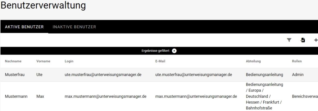In der Benutzerverwaltung finden Sie eine Übersicht über alle Benutzer, welche Ihrem Unternehmen zugeordnet sind. Als Administrator können Sie hier sowohl aktive als auch inaktive Benutzer verwalten, neue Benutzer anlegen und Benutzer bearbeiten.