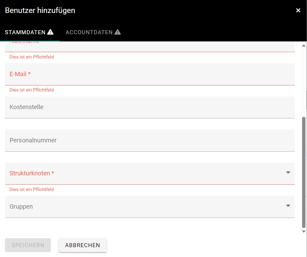 In den Stammdaten werden alle persönlichen Informationen über den Benutzer hinterlegt. Hier können Sie den Namen, sowie E-Mailadresse, Kostenstelle, Personalnummer und den Strukturknoten, zu welchem der Benutzer zuzuordnen ist angeben.