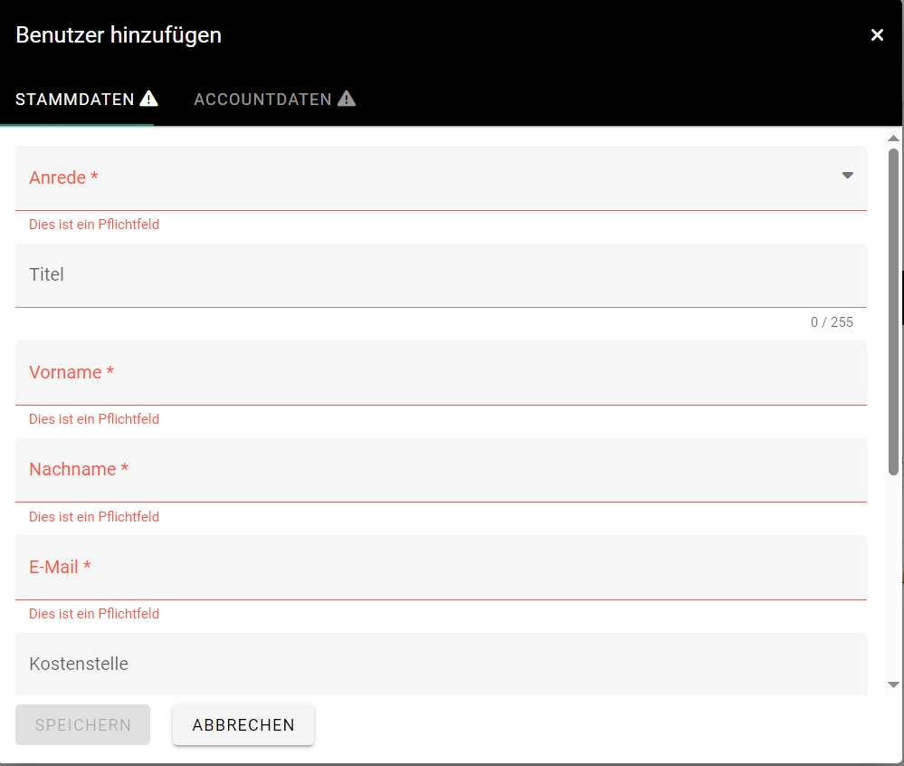 Felder die verpflichtend auszufüllen sind, sind mit einem * und rot gekennzeichnet. Felder, welche noch nicht vollständig ausgefüllt wurden, mit einem Warndreieck.