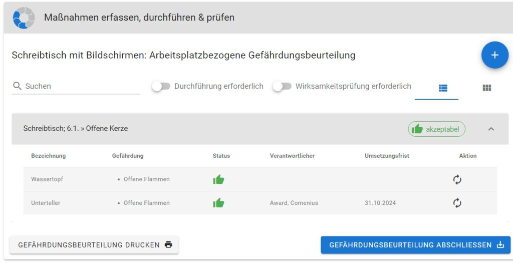 Sobald Sie alle Maßnahmen eingefügt haben und sie auf ihre Wirksamkeit überprüft haben können Sie auf Gefährdungsbeurteilung abschließen klicken. Sie haben danach keine Möglichkeit mehr die Gefährdungsbeurteilung zu bearbeiten.