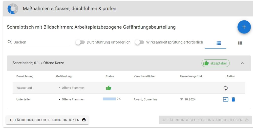 Sobald die Maßnahme zu 100% durchgeführt worden ist, führen Sie über den gleichen Button, mit welchem Sie die Durchführung dokumentiert haben, eine Wirksamkeitsprüfung durch.