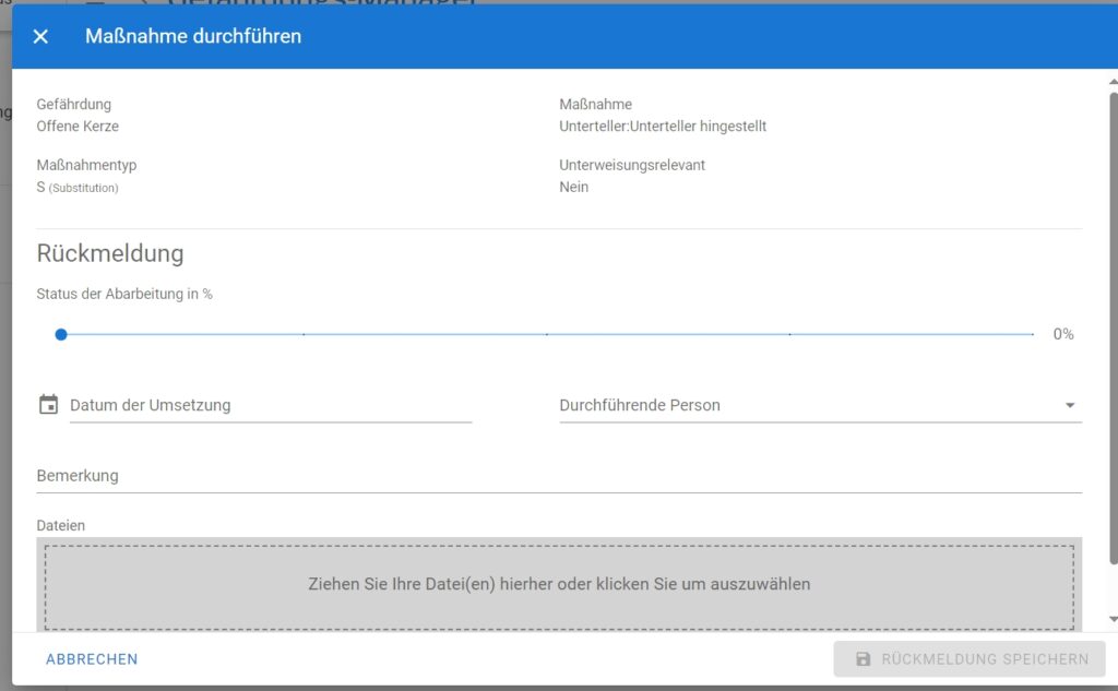 Es öffnet sich ein neues Fenster, in welchem Sie nun die Durchführung der Maßnahme dokumentieren. Dafür geben Sie die Durchführende Person an, das Datum der Umsetzung und den Status der Bearbeitung in Prozent an. Dies bedeutet: Bei Maßnahmen, welche nicht in einem Durchgang abgeschlossen werden, können Sie dadurch den aktuellen Bearbeitungsstand darstellen.