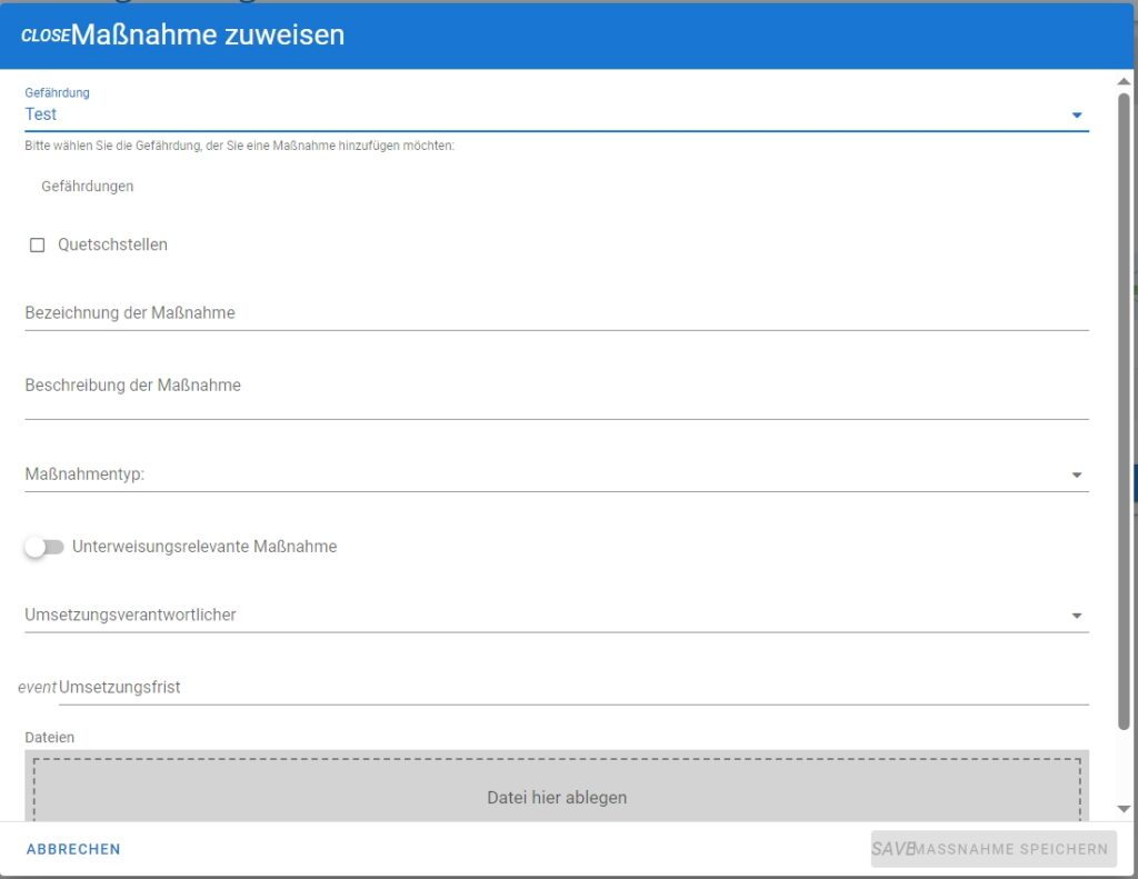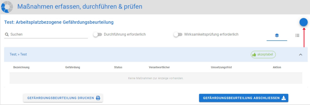m weiteren Schritt erfassen Sie die für die Gefährdung zu ergreifende Maßnahmen. Dafür klicken Sie den blauen Punkt in der oberen rechten Ecke der Seite.
