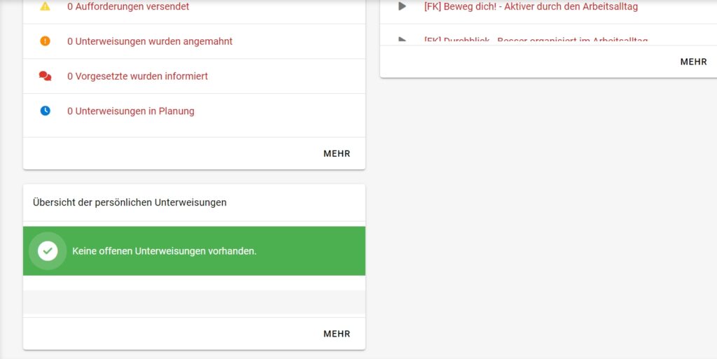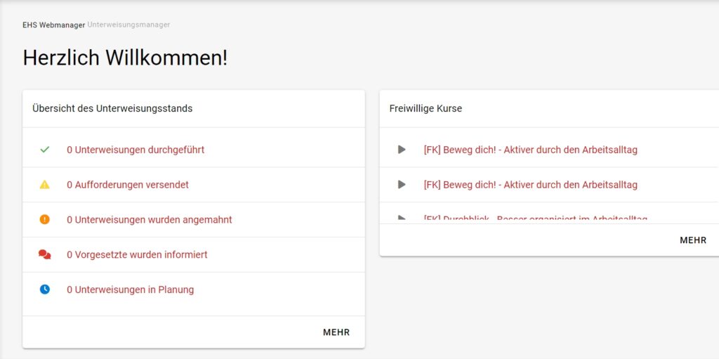 Wenn Sie sich in den Unterweisungs-Manager einloggen, werden Sie zunächst zu der Startseite weitergeleitet. Dort erhalten Sie einen Überblick über den Unterweisungsstand sowohl von den Unterweisungen, die Sie Ihren Mitarbeitern zugewiesen haben, als auch über die Unterweisungen, die Ihnen zugewiesen worden sind. Ebenfalls finden Sie dort eine Übersicht über die freiwilligen Unterweisungen.