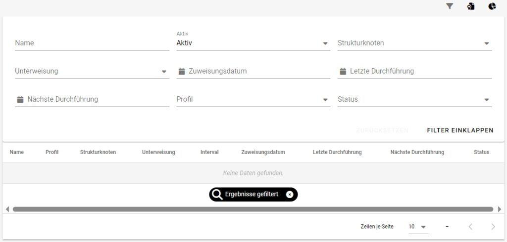 Als Filteroptionen stehen Ihnen der Strukturknoten, die Unterweisung, das Zuweisungsdatum, die letzte Durchführung, die nächste Durchführung, ein Zuweisungsprofil, der Bearbeitungsstatus der Unterweisungen und die Unterteilung in aktive oder inaktive Benutzer zur Verfügung.