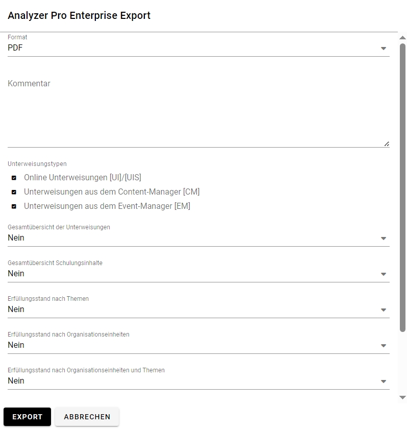 Nachdem Sie den Unterweisungstyp ausgewählt haben, können Sie noch verschiedene weitere Optionen wählen, nach denen Ihr Export gefiltert werden kann: