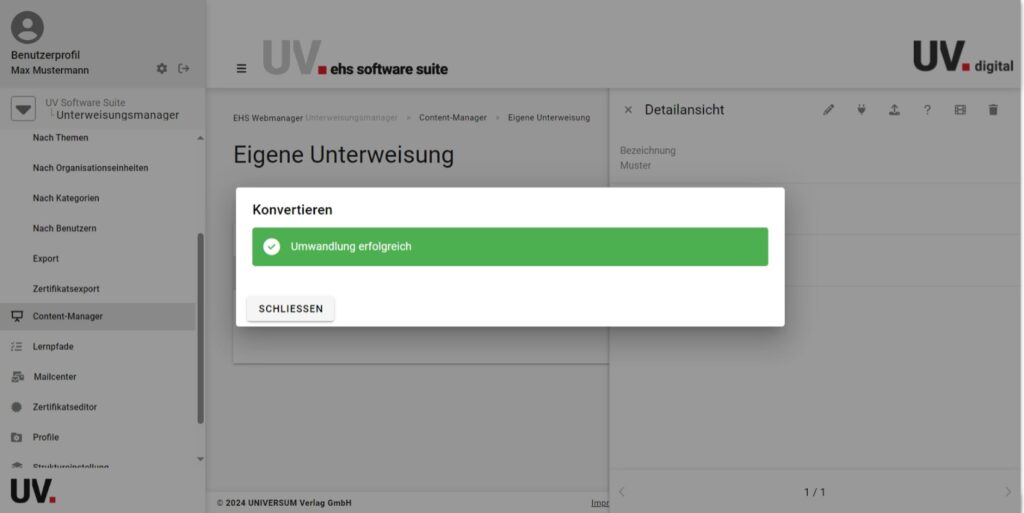 Klicken Sie nun auf das Zahnrad-Symbol. Sobald Sie dies getan haben beginnt die Unterweisung sich zu konvertieren. Wenn dieser Vorgang beendet ist, erscheint ein Feld, welches Ihnen dies mitteilt. Klicken Sie auf Schließen um den Vorgang zu beenden.
