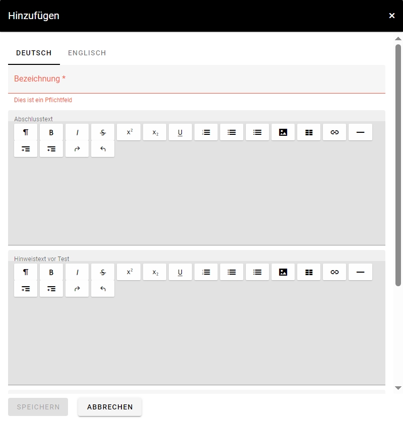 Es öffnet sich ein neues Fenster, in dem Sie Informationen eintragen können. Beachten Sie, dass Sie die Informationen in allen für Sie freigeschalteten Sprachen eintragen. Zunächst wählen Sie eine Bezeichnung für Ihre Unterweisung.