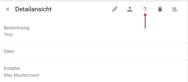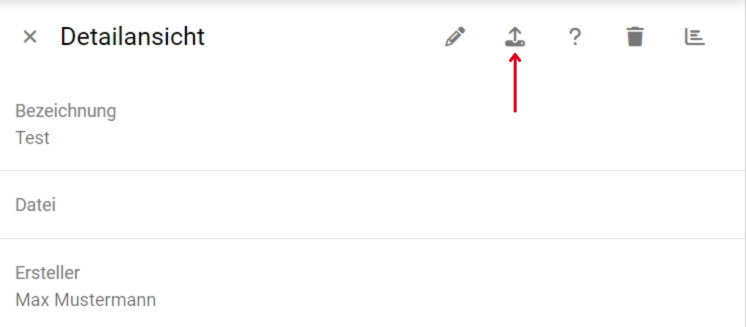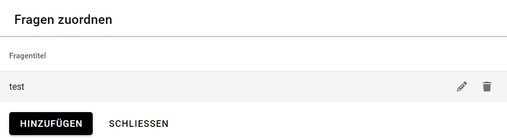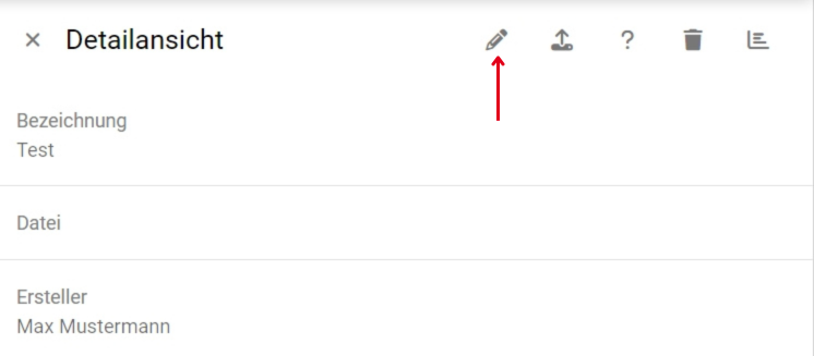 In der Detailansicht haben Sie am oberen rechten Rand die Möglichkeit zur Bearbeitung, zum Datei-Upload, zum Zuordnen von Fragen, zum Löschen und zur Auswertung der Umfrageergebnisse.