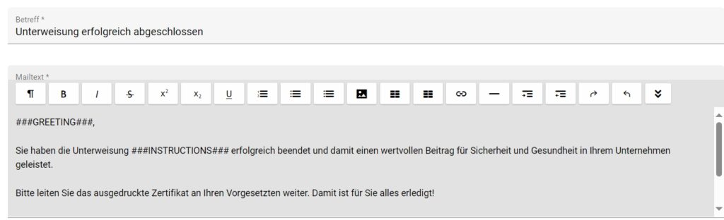 Bei der Konfiguration der Eskalationsstufen gibt es etwas grundlegendes zu beachten. Durch das Aktivieren der Eskalationsstufen triggern Sie automatische E-Mails. Die Bearbeitung dieser E-Mails findet in dem Modul Mail-Vorlagen statt. Dort können Sie zu jedem Textmodul des Unterweisungsmanagers immer zwei Textfelder bearbeiten.