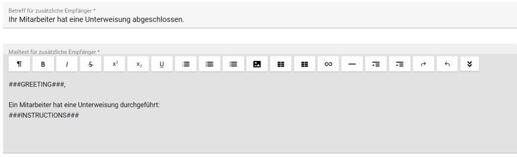 Das obere Textfeld behandelt den Mailtext, der immer dem Angestellten (also dem Benutzer) zugeschickt wird.