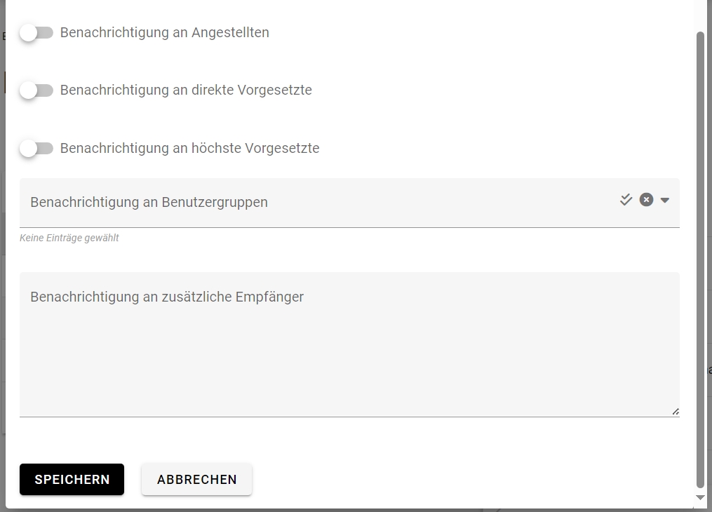 In das Feld Benachrichtigungen an zusätzliche Empfänger können Sie weitere Email-Adressen eintragen, falls Sie die Benachrichtigung auch an externe Adressen versenden wollen. Sie erhalten die gleiche Mail, wie die Vorgesetzten.