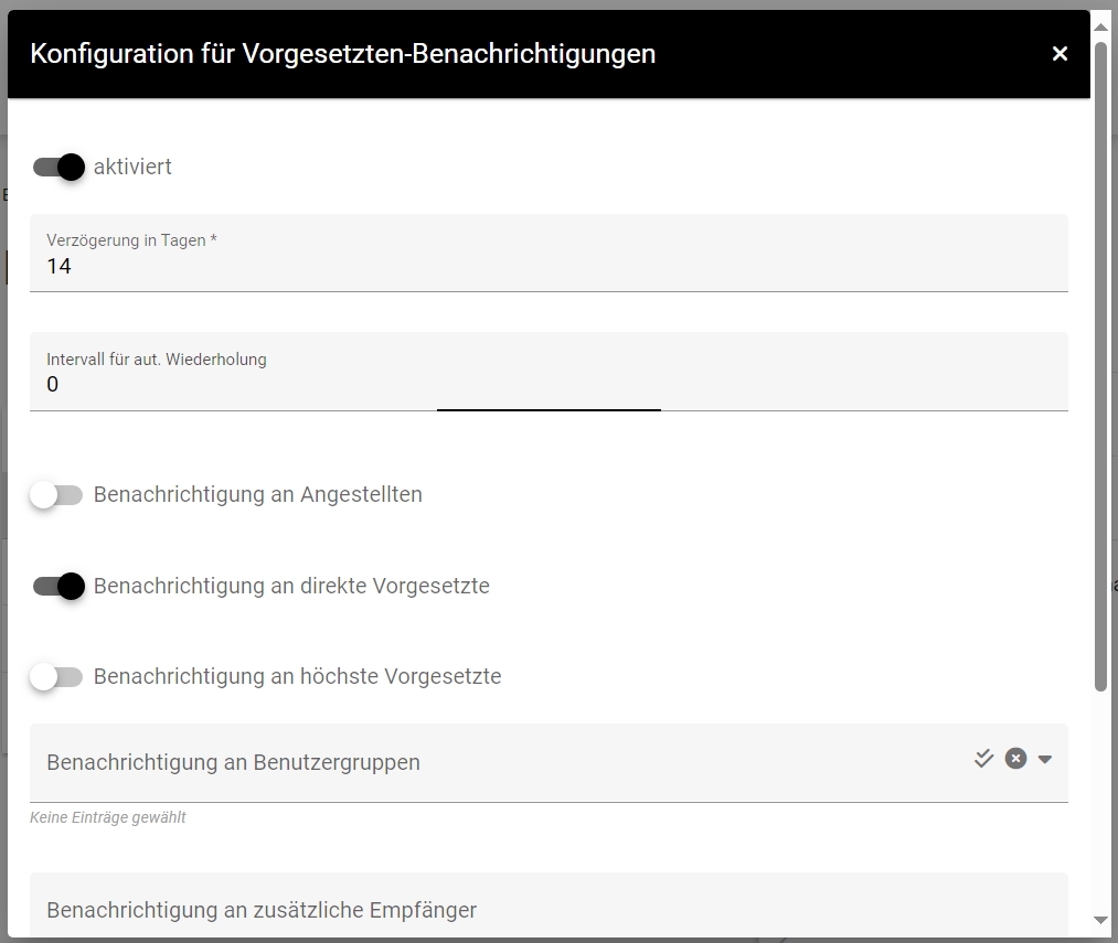 Mit der Verzögerung bestimmen Sie wie viele Tage nach der ersten Erinnerungs-Mail an einen Benutzer der Vorgesetzte benachrichtigt werden soll. Über das Intervall können Sie eine automatische Wiederholung der Mail einstellen.