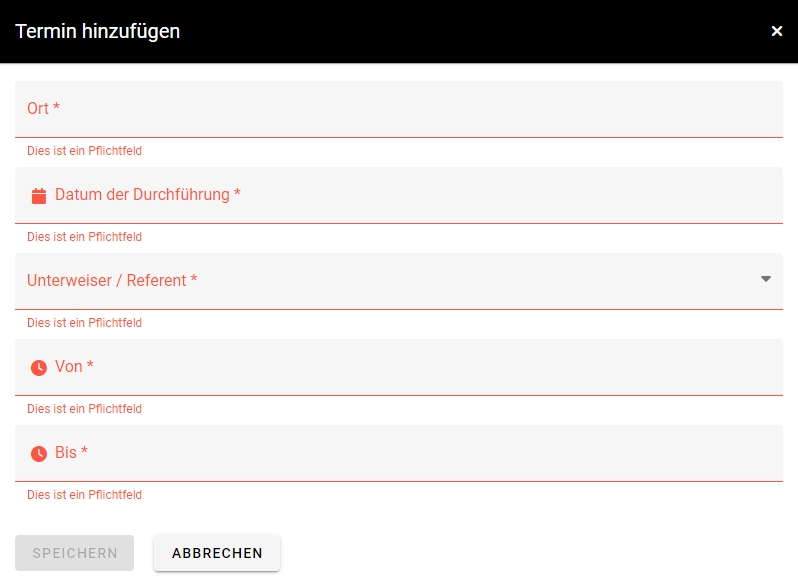 Es öffnet sich daraufhin ein Fenster, in welchem Sie die Details zu dem Termin eintragen können. Hier müssen Sie verschiedene Optionen einstellen, wie bspw. den Ort (wo der Termin stattfinden wird), das Datum (wann dieser stattfindet), wer der Referent ist (Sie können alle aktiven Benutzer auswählen) und von wann bis wann die Vortragsunterweisung geht. Sie haben die Möglichkeit einem Event mehrere Termine zuzuordnen.