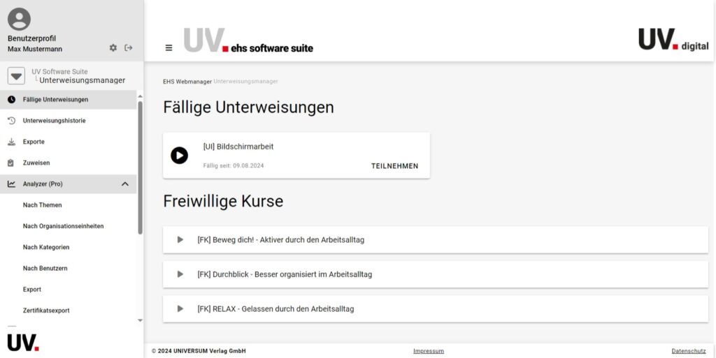 Unter Fällige Unterweisungen sehen Sie ebenfalls die Freiwilligen Unterweisungen. Freiwillige Unterweisungen unterscheiden sich insofern von Pflichtunterweisungen, dass von diesen keine Zertifikate erstellt werden können und Sie diese auch nicht zuweisen können. Freiwillige Unterweisungen sind nämlich grundsätzlich allen Benutzern zugewiesen. Diese können freiwillige Unterweisungen beliebig oft wiederholen.