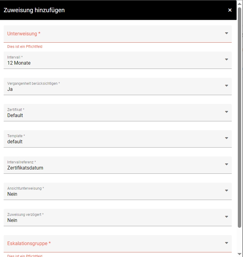 Es öffnet sich ein Fenster, in welchem Sie die Unterweisung hinzufügen können. Wie bereits im Kapitel Zuweisen beschrieben, können Sie nun die Unterweisung, welche Sie dem Profil hinzufügen möchten, auswählen. Anders als über den U-Planer und Einzelzuweisungen geben Sie jedoch kein Startdatum an. Dies liegt daran, dass der Unterweisungszeitraum mit der Zuweisung des Profils beginnt. Wenn Sie dennoch die verschiedenen Unterweisungen terminieren wollen, tun Sie dies über die Einstellung Zuweisung verzögert. Damit können Sie einstellen, dass die Einladungsemail zu der Unterweisung erst zu der von Ihnen eingestellten Verzögerung verschickt wird. Erst mit der Einladungsemail wird die Unterweisung fällig.