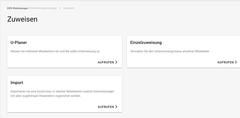 Im Bereich Zuweisen können Sie alle Unterweisungen, die Sie zur Verfügung haben, verwalten und entsprechend an Benutzer zuweisen. Innerhalb dieses Bereichs gibt es verschiedene Möglichkeiten Unterweisungen zuzuordnen: den U-Planer (dieser dient dazu, Gruppenunterweisungen zu planen), Einzelzuweisungen (dies dient dazu Unterweisungen, einzeln zuzuweisen) und Import (hiermit können Sie über eine Importtabelle Unterweisungen zuweisen).