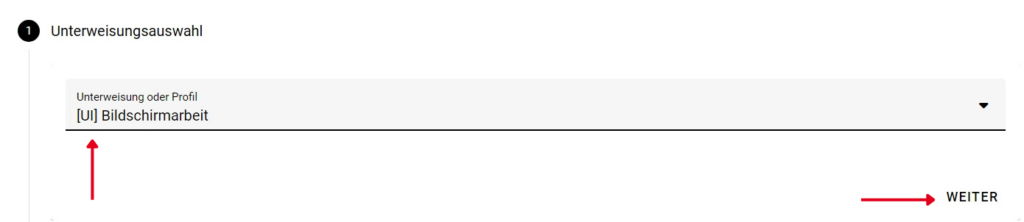 Es öffnet sich ein neues Fenster, in welchem Sie die Planung durchführen können. Wählen Sie zunächst aus, welche Unterweisung Sie planen möchten. Hier stehen Ihnen grundlegend alle Unterweisungen zur Verfügung, die Sie gebucht oder selbst erstellt haben. Welche dies sind sehen Sie bei Ihren Verfügbaren Unterweisungen. Ebenfalls können Sie dort Ihre erstellten Profile auswählen. Bestätigen Sie die Auswahl mit einem Klick auf Weiter.