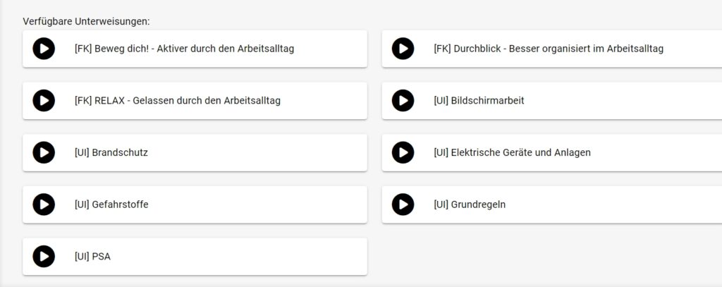 Welche Unterweisungen Sie zur Verfügung stehen haben, sehen Sie im Menüpunkt Zuweisen unter den verschiedenen Optionen, wie Sie Unterweisungen zuweisen können (U-Planer, Einzelzuweisungen, Import). Dort finden Sie ebenfalls den von Ihnen selbst erstellen Content, wie Unterweisungen, Umfragen und Events. Die angezeigten Unterweisungen können Sie beliebig oft simulieren.